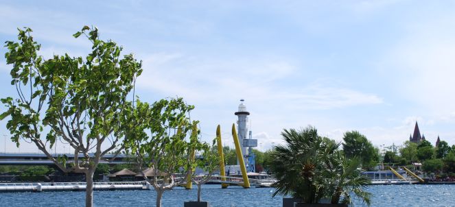 Jetzt nehmen wir schon die Pontonbrücke in den Blick, über die wir auf die Donauinsel gelangen, auf die Terrasse eines griechischen Restaurants, wo uns ein feiner alkoholfreier Cocktail serviert wird, und von dort zur U-Bahn "nach Hause" zum Stephansplatz...