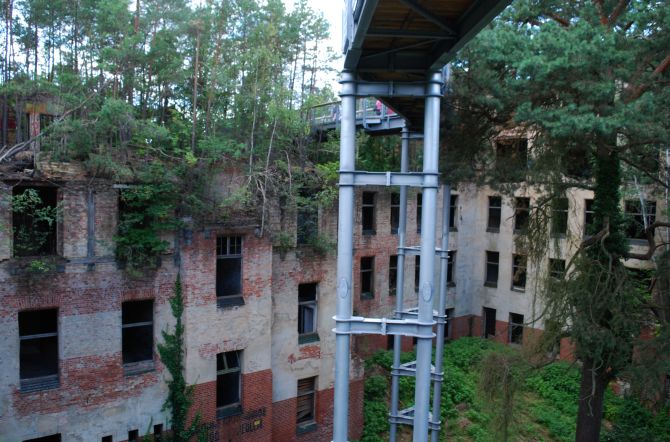 In den letzten Tagen des 2. Weltkriegs brannte das Haus aus, insbesondere die beiden Obergeschosse wurden schwer zerstört. Die Sowjetarmee, die das Gesamtgelände zu DDR-Zeiten als Militärhospital nutzte, sanierte dieses Haus nicht und so hatte die Natur inzwischen 70 Jahre Zeit sich am, im und auf dem Haus einzurichten. Gleichermaßen verstört und fasziniert blickt der Besucher darauf...
