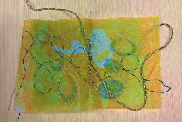 Also ein "regelrechtes" Muster mit Ovalen habe ich auch nicht zu bieten, aber immerhin gemusterte Ovale... Beim Buchbindewochenende mit der Enkelin fielen Schnipsel und Reststreifen vom Kleisterpapier an, die ich zu Ovalen und Spiralen geschnitten habe, zunächst noch ohne Idee dazu. Dann fiel mir beim Aufräumen des Werktisches ein Abklatschpapier mit Probedrucken in die Hand, mit Michaelas Vogel-Stempel und Rosetten-Schablone hatte ich das Papier versehen und vom Workshop mitgenommen. Ein gebatiktes Seidenpapier und hellgrüne Strohseide war auch noch da. Denn weil ja Ostern vor der Tür stand, kam mir eine Kindheitserinnerung.